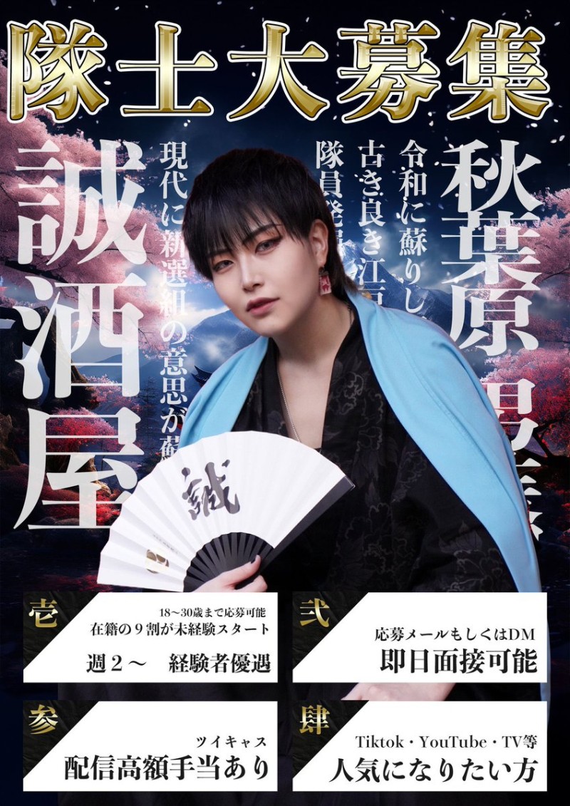 19:00〜 空煌 @akira_makotoz 訓練スタートしました🏯🌕 #秋葉原 #男装カフェ #誠酒屋 #TikTok #求人募集 #コンカフェ #コスプレ #ツイキャス #配信 #幕末 #新撰組 https://t.co/QloAfcqacr