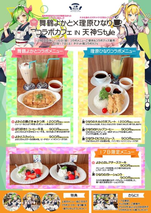 今週土曜日までは舞鶴よかとちゃん×理原ひなりちゃんコラボカフェ💚💛 今週日曜日はまおバースデー🎀 慌ただしく12月が過ぎておりますが、天神Styleは来週からクリスマスイベントです🎄 本日はクリスマスのメニューを試作しました🌟 https://t.co/O7Kd29yzvs