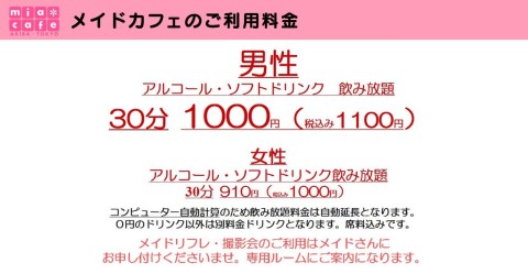 営業時間 12:00〜22:00(最終受付21:20) 定休日 不定休 深夜営業については、公式ページ右上の深夜営業日案内を ご覧ください(金曜・土曜日を中心に深夜営業予定)。 深夜営業対象日 22:00〜翌朝5:00(最終受付 翌朝4:20) http://market.chu.jp/schedule1/sche37.cgi ミアグループ総合スケジュール(PC&スマホ) http://market.chu.jp/schedule1/sche37.cgi?dm=1 ミアグループ総合スケジュール(ガラケー) 告知日のみ営業となります。告知日以外は深夜営業いたしておりません。