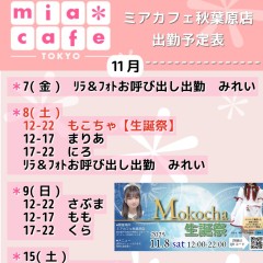 ★#メイドカフェ ・ミアカフェ #秋葉原 店★ ☕️営業予定日☕️ 🎀11月7日(金)  リラ&フォトお呼び出し出勤 みれい 🎀11月8日(土)もこちゃ生誕祭EV  12-22 もこちゃ  12-17 まりあ  17-22 にろ  リラ&フォトお呼び出し出勤 みれい 🎀11月9日(日)  12-22 さぶま  12-17 もも  17-22 くら https://t.co/zrYqBDgGKD