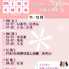 ★#メイドカフェ ・ミアカフェ #秋葉原 店★ ☕️営業予定日☕️ 🎀11月29日(土)  12-17 いおり,にのん【あの元ダブル店長ズ出勤!✨】  17-22 くら,にろ 🎀11月30日(日)  12-22 さぶま  12-17 もも  17-22 くら 🎀12月5日(金)  18-22 にろ 🎍#年賀状 →https://t.co/CjIVfjb9cH #コンカフェ https://t.co/5iLXk9rBQd
