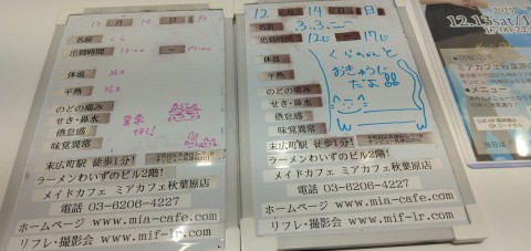 営業時間 ●ミアカフェ東京店(メイドカフェ)http://www.mia-cafe.com/ ● □平日 月~金 17:00~22:00 □土曜・日曜・祝日 12:00~22:00 ★定休日 なし(2019年1月より定休日廃止) □ラストオーダー 閉店の60分前  22:00閉店の場合→21:00ラストオーダー 営業日や出勤状況についてはこちら。 http://pandaland.cutegirl.jp/mif/c_cms_csv/sch_top.php ●ミアリラ&フォト東京店(撮影会&リフレ)http://www.mif-lr.com/ ● □全日 12:00〜22:00 ですがリラクゼーション出勤スタッフがいる時間帯のみ営業です。 ★定休日は不定休(出勤スタッフがいる時間帯の営業) □最終受付 閉店の45分前  22:00閉店の場合→21:15(21:50迄に施術時間が終わるコース) ※高校生不可 ●深夜営業については、公式サイト右上の http://market.chu.jp/schedule1/sche37.cgi ミアグループ総合スケジュール(PC・スマホ) http://market.chu.jp/schedule1/sche37.cgi?dm=1 ミアグループ総合スケジュール(ガラ携帯) をご覧ください。告知日のみ営業となります。告知日以外は深夜営業いたしておりません。 深夜営業対象日 22:00〜翌朝5:00(L.O.4:00)
